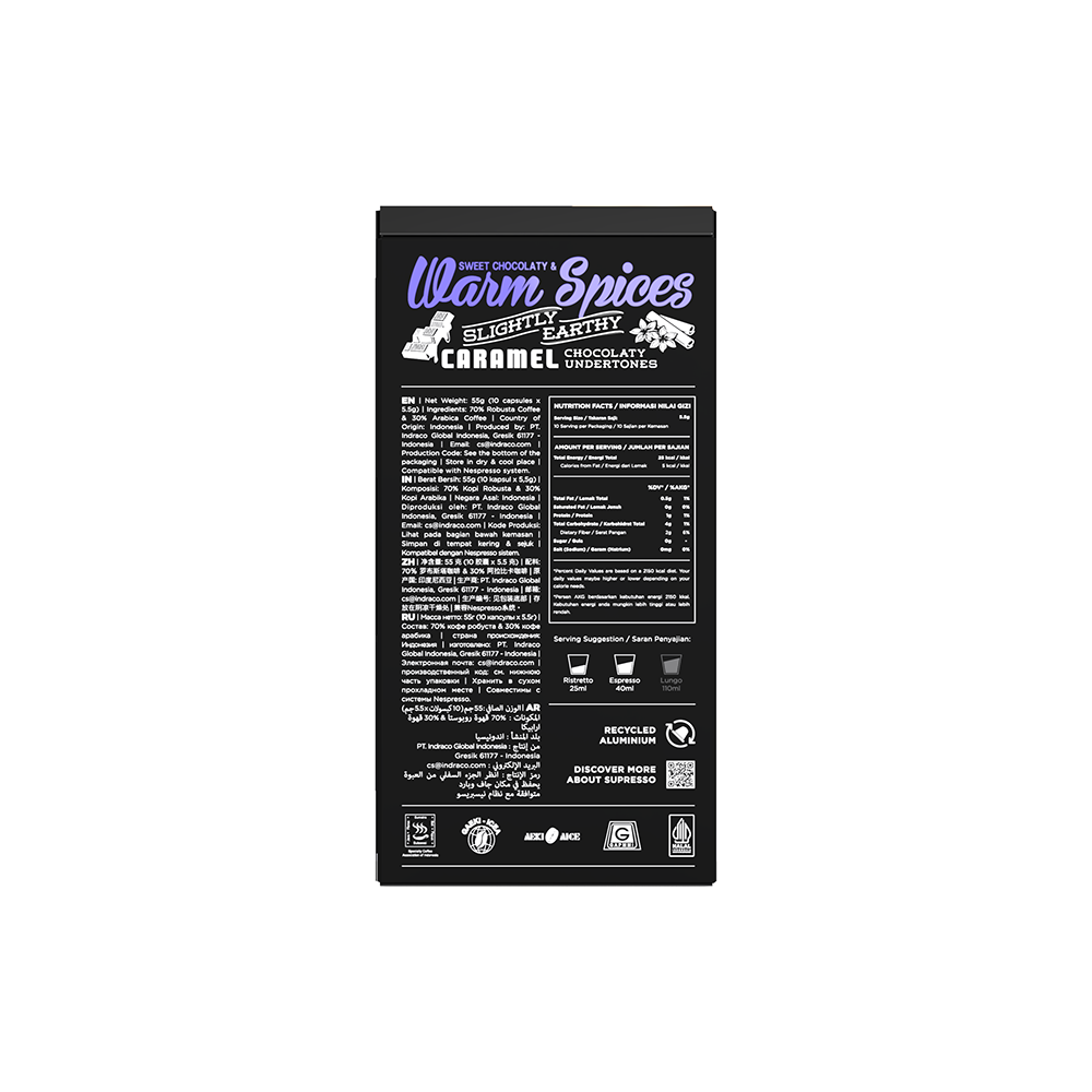 30% Arabica - 70% Robusta. A 30/70 blend of Arabica and Robusta beans originating from the different regions of Indonesia and roasted with the City+ Roast mode. Taste the complementary sweet chocolaty hints, warm spices and slight earthiness amongst the caramel chocolaty undertones, with lower acidity and strong body.